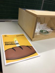 In einem Demenzparkour werden typische Symptome einer Demenz simuliert. Wie fühlt es sich an als Demenzkranker zu essen? Wie schreiben Erkrankte sich eine Einkaufsliste? Wie erlebt man das tägliche Aufstehen und Anziehen? Durch das Durchlaufen der Stationen konnten die Schülerinnen und Schüler eben diese Dinge am eigenen Leib erleben.