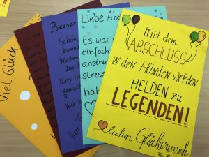 Diese und noch viele andere Wünsche kamen auch vom Lehrerkollegium, das leider nicht an der Verabschiedung teilnehmen durfte. Kreative und persönliche Plakate wurden gestaltet und hingen neben der Bühne als netter Gruß.