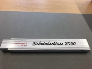 Anschließend begrüßte Ludger große Holthaus die Anwesenden und verlas einen Gruß des Samtgemeindebürgermeisters Michael Wernke an die Schülerinnen und Schüler, die jeweils von zwei Personen begleitet werden durften. Herr große Holthaus nahm in seiner Rede einen Brief eines Schülers aus Marburg als Ausgangspunkt, der sehr treffend die Corona bedingte Situation mit den damit verbundenen Ängsten, Sorgen und Hoffnungen der jungen Menschen schildert und damit einen Nerv traf. Humorvoll schilderte er zum Abschluss, dass er die Schülerinnen und Schüler hinsichtlich des Einhaltens der Abstände beobachtet habe und schenkte ihnen zum Abschied einen von-Ravensberg-Zollstock als Erinnerung an diese merkwürdige Zeit.