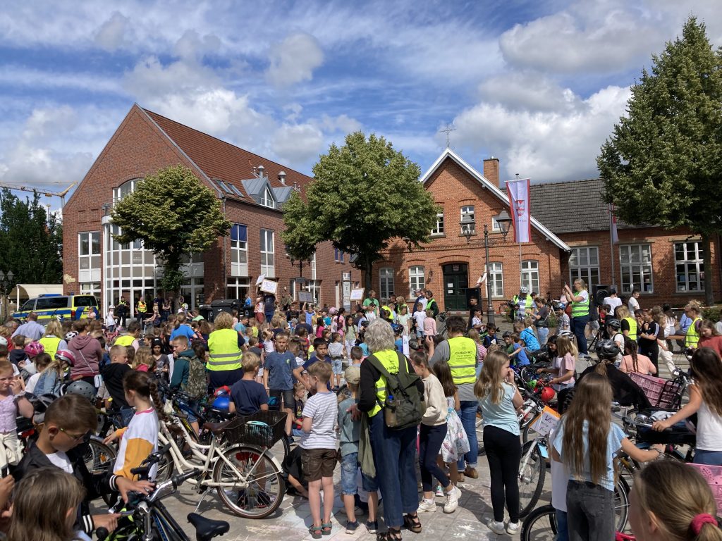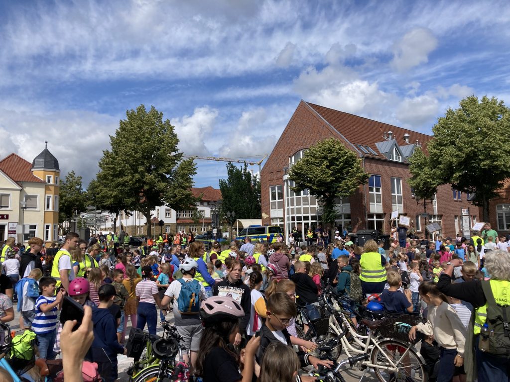 Schülerinnen und Schüler der Grundschule Bersenbrück haben heute für mehr Sicherheit im Straßenverkehr mit ihren Fahrrädern demonstriert. Auf dem Weg zum Kundgebungsplatz holten sie Schülerinnen und Schüler der von-Ravensberg-Schule ab. Unsere Schülerinnen und Schüler begleiteten den Demonstrationszug zu Fuß.