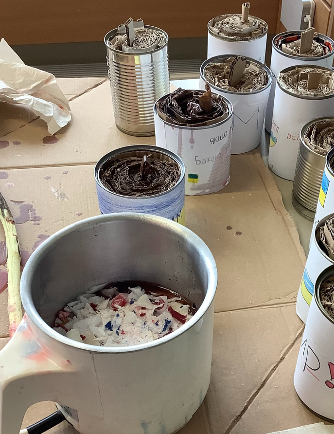 Wir haben alte Dosen, Wachsreste und Pappen gesammelt. Als Erstes haben wir die Pappe ganz eng eingerollt und in die Dosen geschoben. Nachdem wir die Wachsreste zerkleinert und geschmolzen haben, wurde der flüssige Wachs in die gefüllten Dosen gegossen. Zum Schluss haben wir die fertigen Dosenkerzen von außen bunt beklebt. Dabei hatten wir viel Spaß und Musik gehört. In unserem Jahrgang haben wir mehrere Kinder aus der Ukraine, die diese Aktion sehr toll finden.