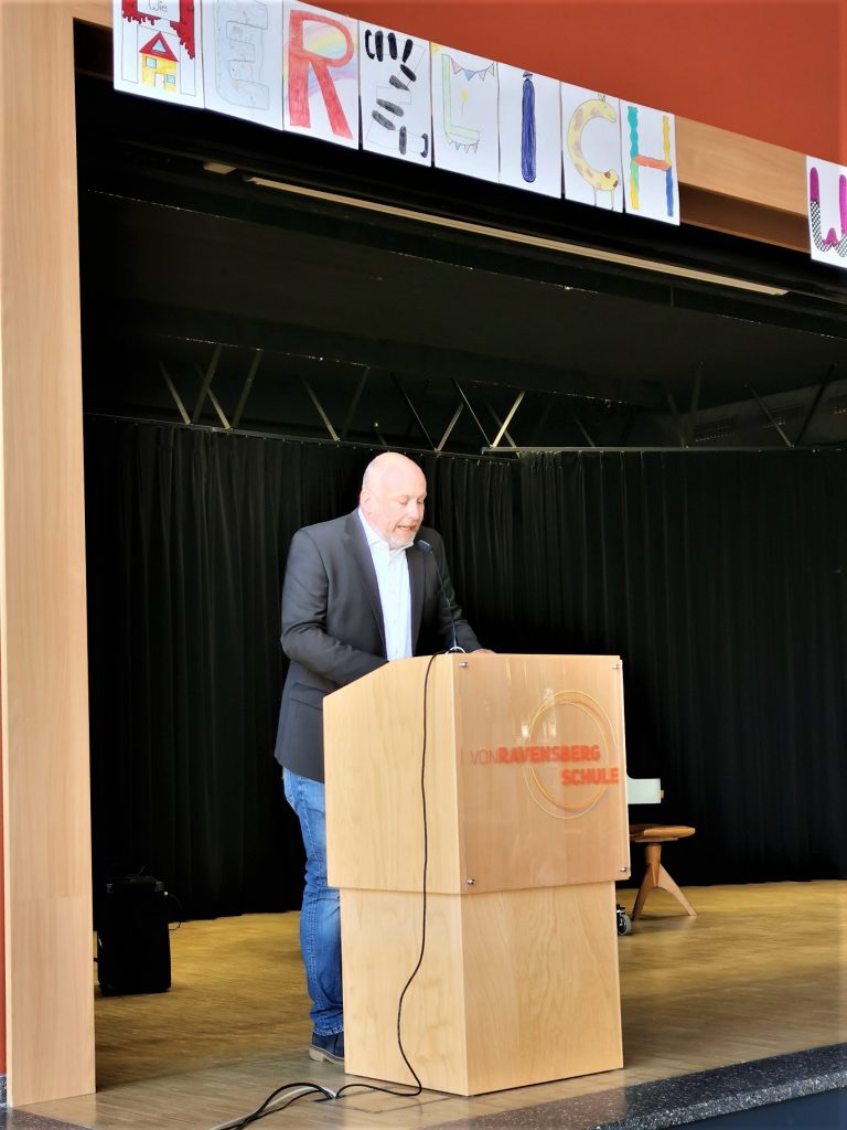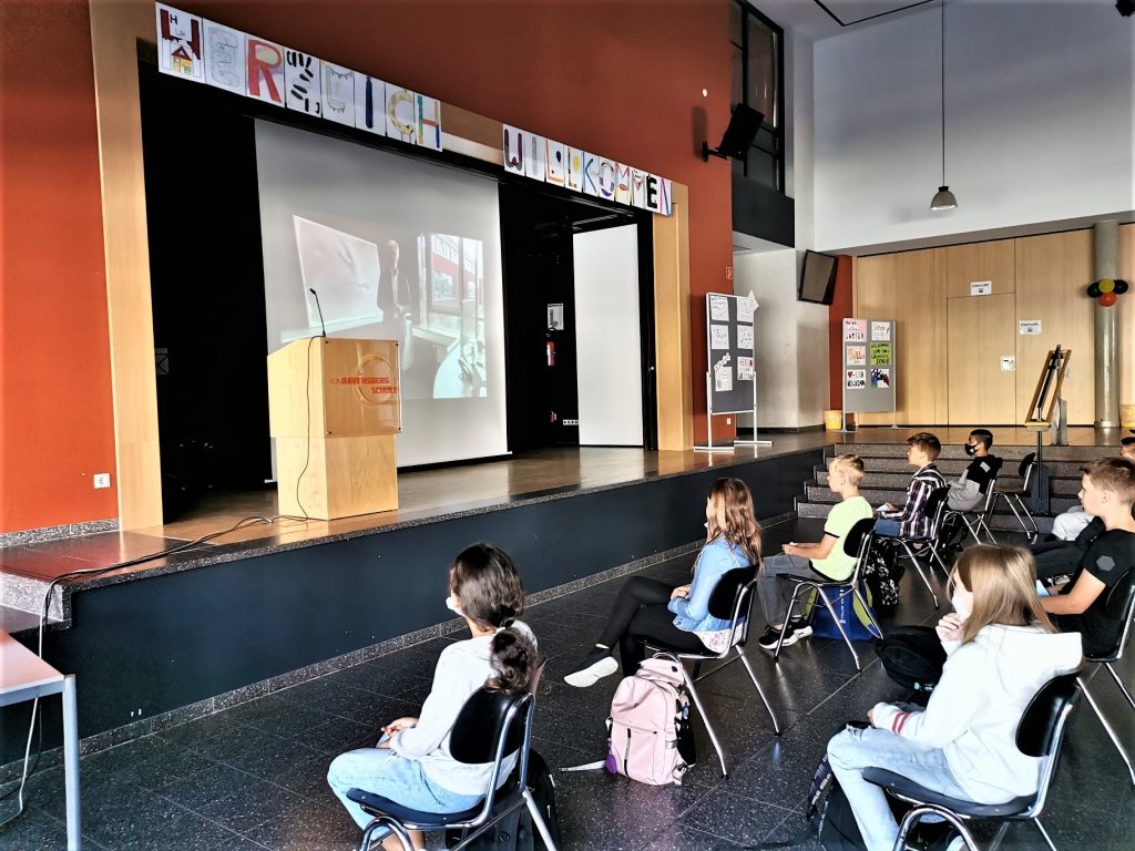 Im wahrsten Sinne des Wortes war es ein herzliches Willkommen an der von-Ravensberg-Schule am Freitag, dem 3. September 2021. Ab 8 Uhr 30 begrüßten wir unsere neuen 5. Klassen zu einer kleinen Feierstunde in der Aula. Die Schüler_Innen der 5a machten den Anfang. Sie saßen in coronakonformem Abstand direkt vor der Bühne, dahinter – ebenso auf Abstand – ihre Begleitpersonen. Gekrönt wurde die Bühne mit bunten Willkommmensschildern und auch neben der Mensa, in welcher das Elterncafé stattfand, wurden bunte Willkommensgrüße auf Stelltafeln ausgestellt. Diese Grüße hatten die älteren Schüler für unsere Neuankömmlinge gemalt.