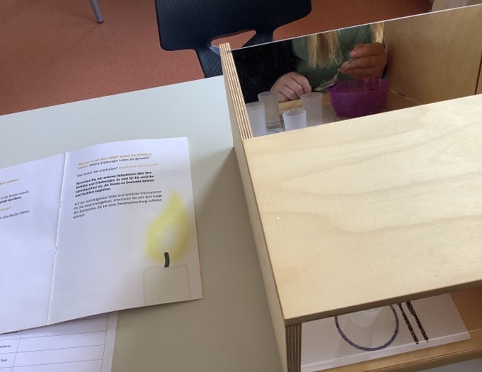 Bei diesem „Spiel“ ging es darum, mit einem Löffel eine Murmel in einen Becher zu legen. Das Schwierige war aber, dass man vorher einen Zettel ansehen musste, wo z.B. Rot stand, aber das Wort in Blau angemalt war. Dazu musste man sich die Reihenfolge merken und es in den jeweiligen Becher legen, zudem durfte man nur durch einen Spiegel schauen.  Das machte das Ganze ziemlich schwierig und man konnte  sich mal in die Lage eines älteren Menschen hinein versetzen, der Probleme mit seinen Augen und/oder dem Gedächtnis hat.