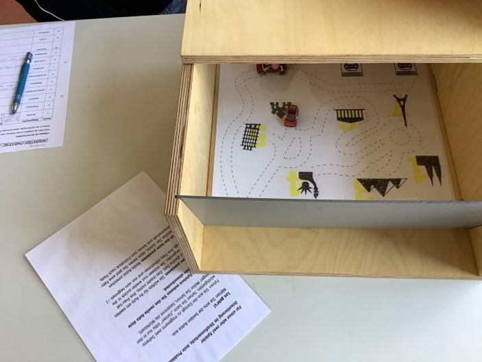 Hier bekam man einen Würfel und musste dann mit dem Spielzeug- Auto zu den gewürfelten Orten fahren. Das Schwierige war aber, dass man durch den Spiegel auf der anderen Seite schauen musste und man oft die Orientierung verlor. Bei älteren Menschen ist es auch oft so, dass sie nicht wissen, wo sie hin müssen oder wo sie sind. Obwohl sie den Weg immer gegangen sind.