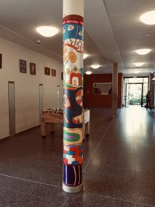 Eine graue Säule mitten im Schulgebäude finden Sie langweilig? Das finden wir auch! Deshalb haben wir, die Schülerinnen und Schüler der AG „School-Art“, uns zusammen mit unserer Lehrerin Frau Roll Gedanken gemacht, wie wir diese Säule aufpeppen können. Im Design des Künstlers Hundertwasser haben wir im Vorfeld viele verschiedene Elemente entworfen und sie dann zu einem bunten Ganzen zusammengefügt. Das Ergebnis: die vorher fade Säule erstrahlt nun inmitten des Erdgeschosses in bunten Farben und schafft eine tolle Atmosphäre! Auch unserer Schule haben wir dabei Tribut gezollt, indem wir die Initialien „VRS“ (von-Ravensberg-Schule) verewigt haben.