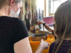 Normalerweise obliegt diese Aufgabe den Schülerinnen und Schülern unseres Bienen-WPKs, doch da diese sich zu diesem Zeitpunkt im Homeschooling befanden, musste ein Ersatzschleuderteam gefunden werden. Gesagt, getan: Unser Kollegium krempelte die Ärmel hoch und machte sich an die Arbeit. Unter der Anleitung von Frau Schlüns traf man sich am Nachmittag in der Schule. Zunächst wurden die Deckel der Waben mit einem speziellen Kamm abgeschabt, senkrecht in die Wand der Schleuder gestellt und dann kräftig geschleudert. Anschließend konnte der wertvolle Honig durch ein Sieb gewonnen und in Gläser abgefüllt werden. Natürlich gab es für alle fleißigen Helfer im Anschuss auch eine leckere Verköstigung.