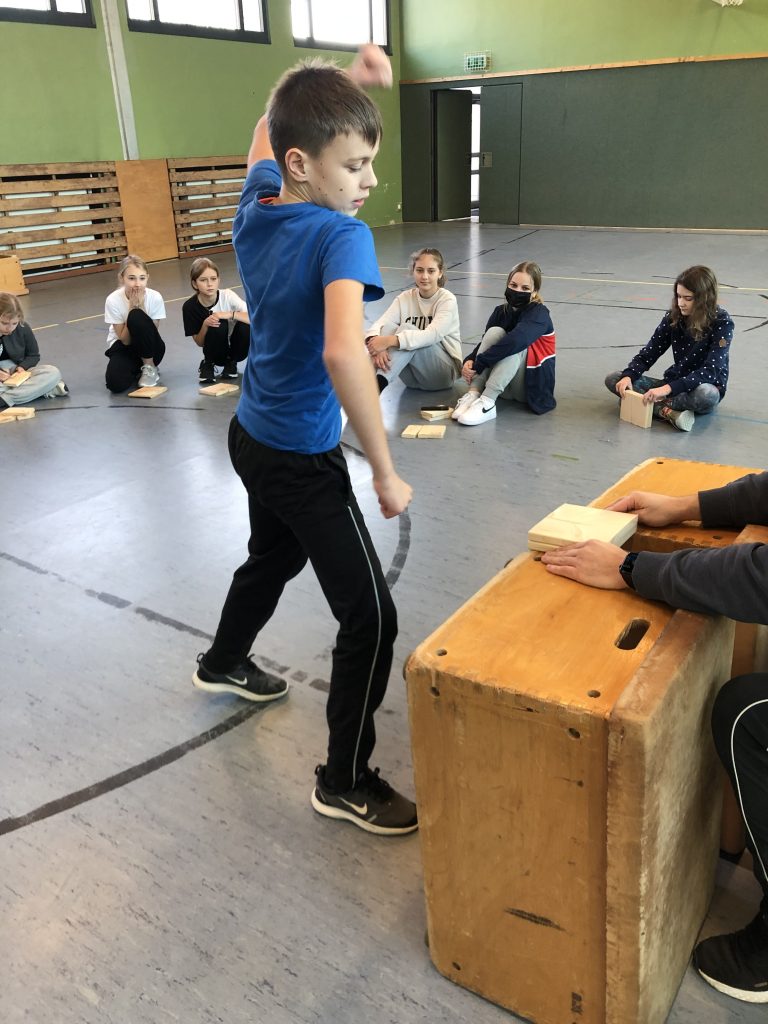 Die Schüler lernten, sich angemessen zu behaupten und durchzusetzen, Grenzverletzungen zu vermeiden und Grenzen zu setzen. Außerdem übten sie den Einsatz einer klaren Kommunikation und Körpersprache. Die Vermittlung der Inhalte erfolgte durch erfahrungs- und handlungsorientiertes Lernen, so dass der Spaß an den Übungen nicht zu kurz kam. Den Abschluss des Projektes bildete der sogenannte Bruchtest, bei dem die Schüler lernten, ein Brett mit der bloßen Hand zu zerschlagen. Das Erstaunen war sehr groß, als nahezu alle Schüler ihr zerschlagenes Brett in Händen hielten. Alle waren sich einig, dass sie etwas geschafft hatten, was sie sich niemals zugetraut hätten.